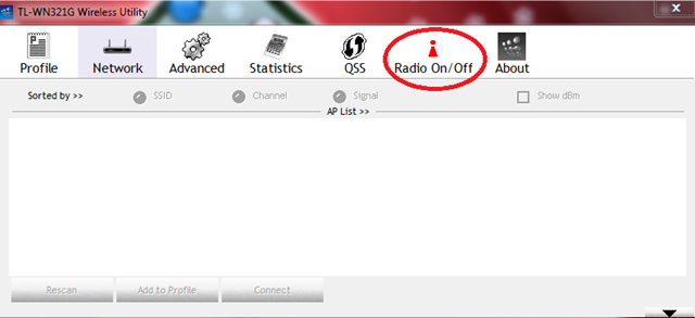 Step1: Connect your wifi device to your PC and make sure it’s Radio Signals are ON. I have TP-Link  WN321G device for which turning on radio is an easy task. Go to Start>>All Programs>>TP-LINK>>TL-WN321G Wireless Utility. (Make sure you have installed TP-Link drivers already. For windows XP, you will have to use the CD which comes with the device box while if you are using windows 7 then you are lucky because it will automatically download the drivers from an internet). After the utility window pops up, click “Radio ON/OFF” button to activate RF signals.