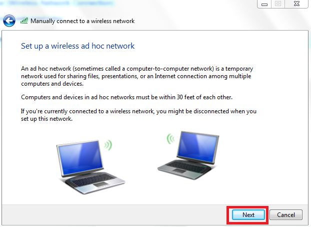 Choose "”Create an ad hoc network” as indicated by red rectangle above. The next window will show a little description of ad hoc networks. Click “Next”.