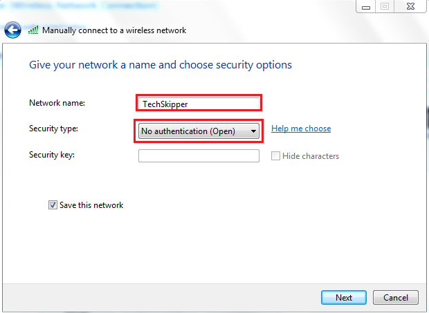 Step 3:  Choose the network name (Like TechSkipper) and choose Security type as “No authentication (open)”.