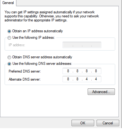 Select “Use the following DNS server addresses” and write 8.8.8.8 in preferred DNS server and 8.8.4.4 in Alternative DNS server. Click OK. You may require to reset the connection to apply the changes.